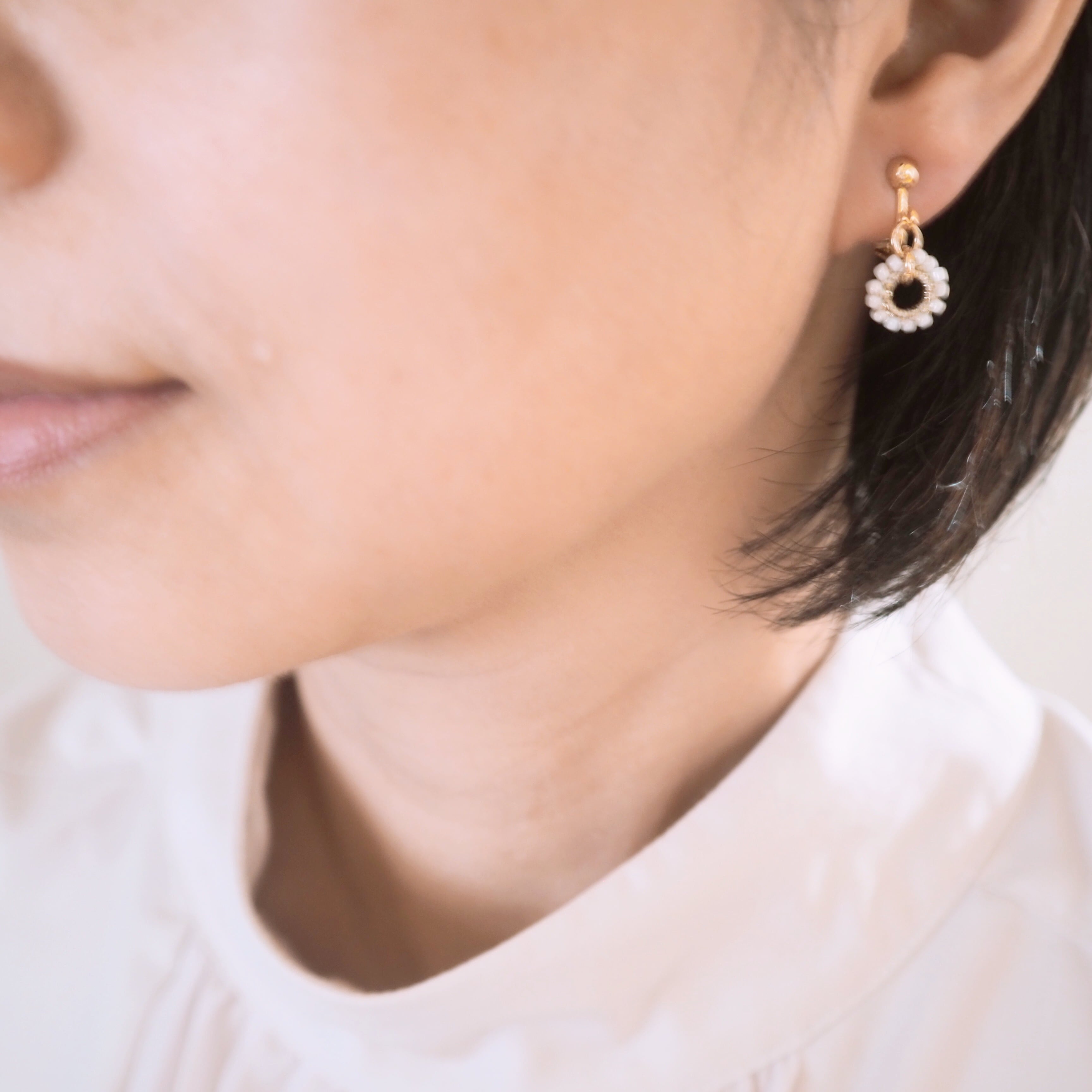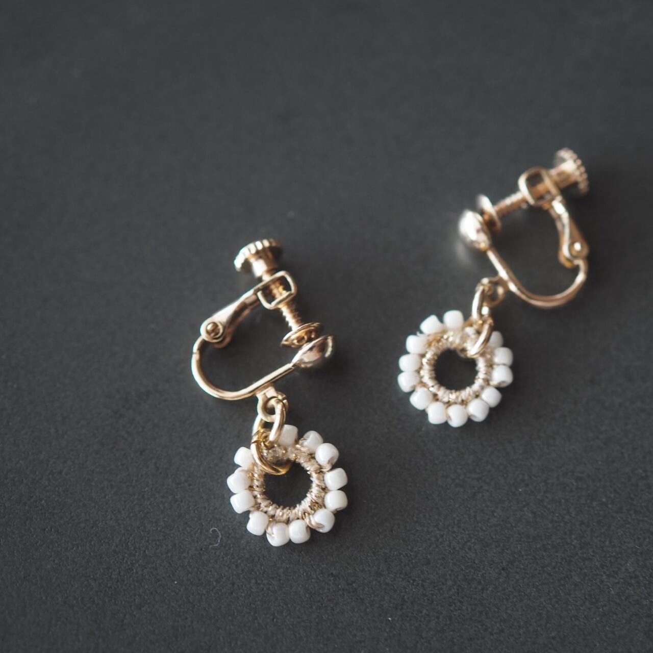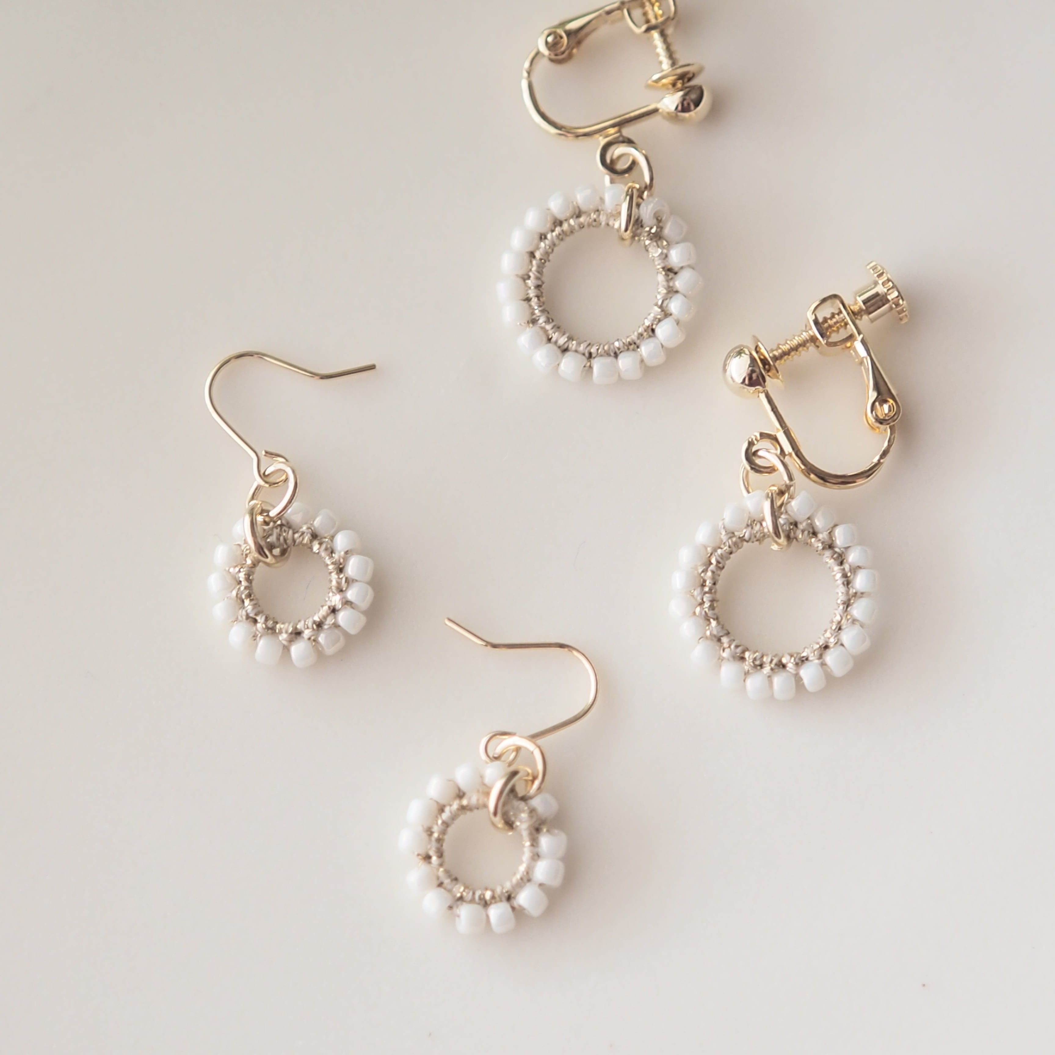 丸い白粒マクラメレース ピアス/イヤリング 【ゴールド】 小さめ