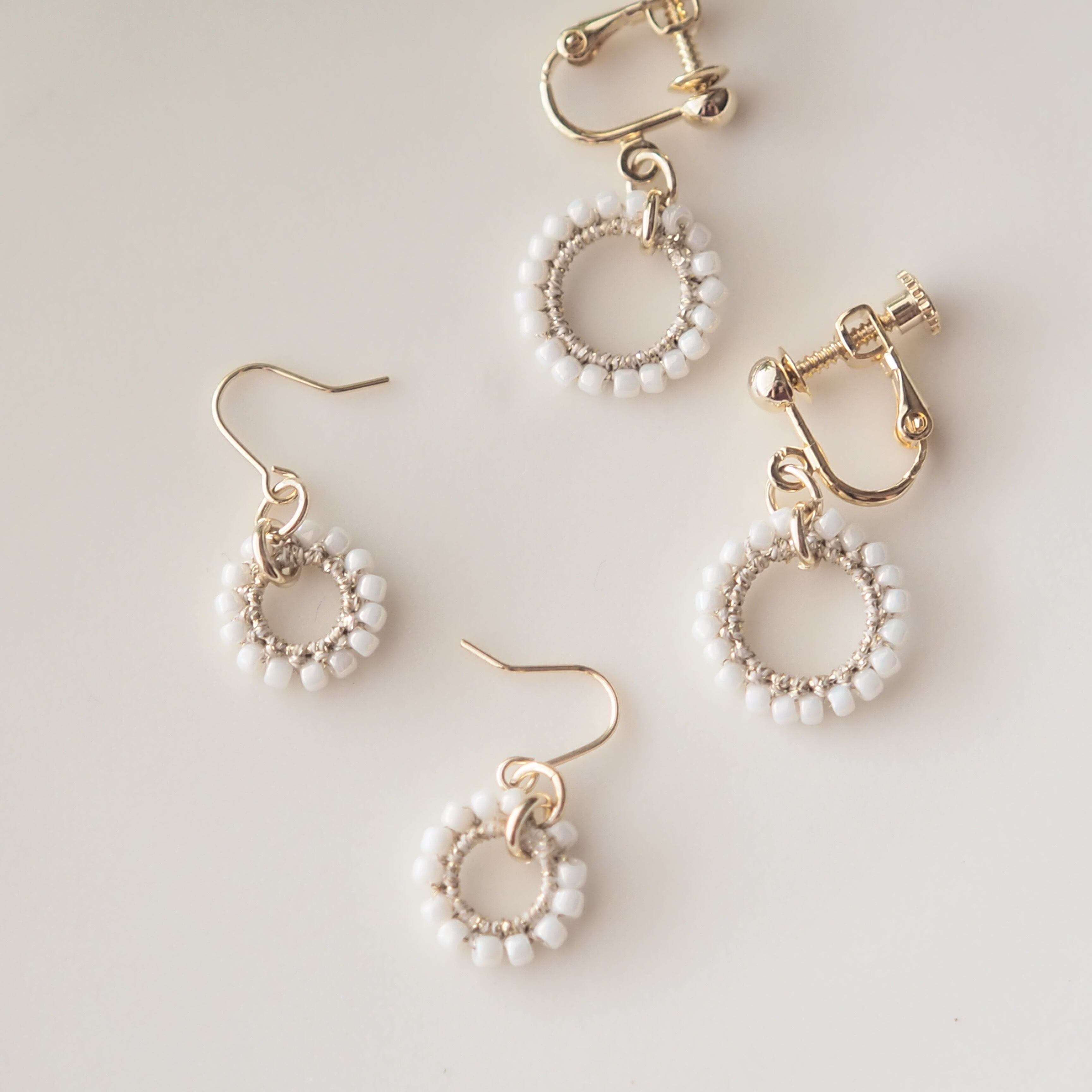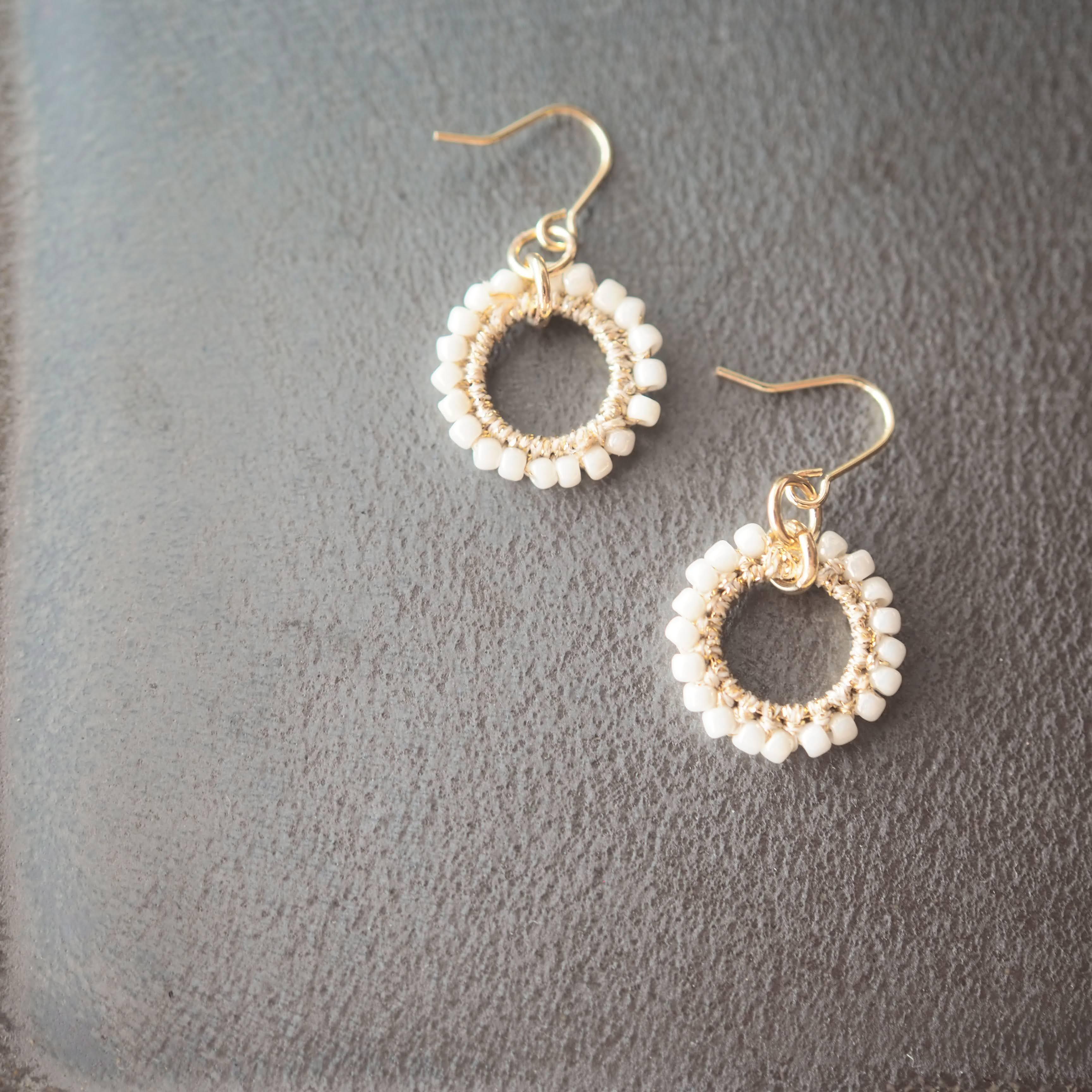 丸い白粒マクラメレース ピアス/イヤリング 【ゴールド】 大きめ